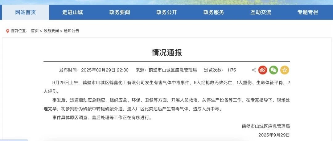 9月29日,河南省鹤壁市山城区应急管理局就辖区内一起安全生产事件公开发布情况通报。ehs.cn 情况通报称,9月29日上午,鹤壁市山城区鹤鑫化工有限公司发生有害气体中毒事件,5人经抢救无效死亡,1人重伤、生命体征平稳,2人轻伤。 事发后,迅速启动应急响应,组织应急、环保、卫健等方面,开展人员救治、关停生产设备等工作。在专家指导下,现场处理完毕,初步判断为硫酸中转罐硫酸外溢,流入厂区化粪池后产生有毒气体,造成人员中毒。 事件具体原因调查、善后处理等工作正在有序进行。